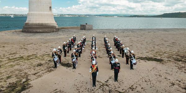 Some free time in between musical engagements allowed for a spot of team building, with the Band taking the opportunity to tackle the HMS Raleigh assault course, finishing off with everyone jumping into the ‘Sheep Dip’ for a group photo. Another photo opportunity saw the Band travel out to Plymouth Breakwater, where we were joined by Brigadier Mike Tanner RM and Bear Grylls, an Honorary Colonel in the Royal Marines.